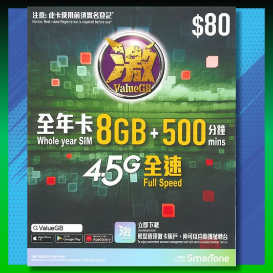Smart ValueGB激 4.5G 8GB 1年 香港本地數據卡 - 養號必備