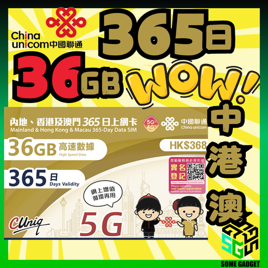 中國聯通 中國 香港及澳門365日 36GB 數據卡 - 免翻牆 支援所以Apps