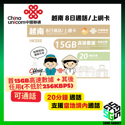 China Unicom 4G/3G Vietnam 8-day call/internet card (unlimited Internet + 20 minutes of calls) first 15GB high-speed data