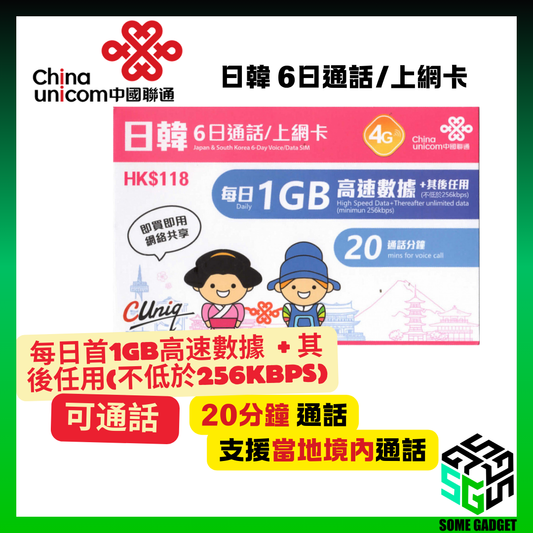 China Unicom 4G/3G Japan and South Korea 6-day call/internet card (unlimited Internet access + 20 minutes of calls), first 1GB of high-speed data per day