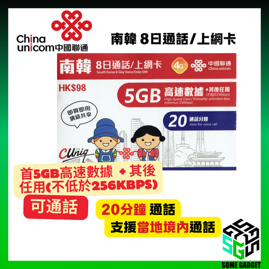 China Unicom 4G/3G South Korea 8-day call/internet card (unlimited Internet + 20 minutes of calls) first 5GB high-speed data
