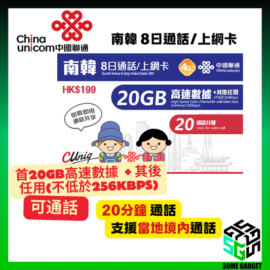 China Unicom 4G/3G South Korea 8-day call/internet card (unlimited Internet + 20 minutes of calls) first 20GB high-speed data