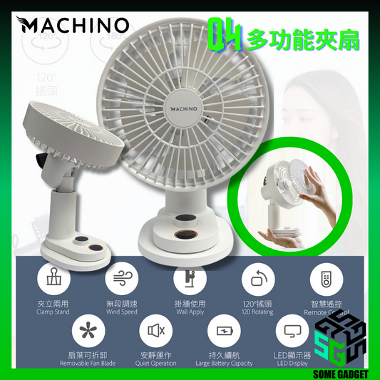 Machino - Q4 Multi-Function Clip Fan|5 Blades|Clamp Stand|Wall Mount|4000mAh|120° Fixed-Point Shaking Shake|Licensed in Hong Kong