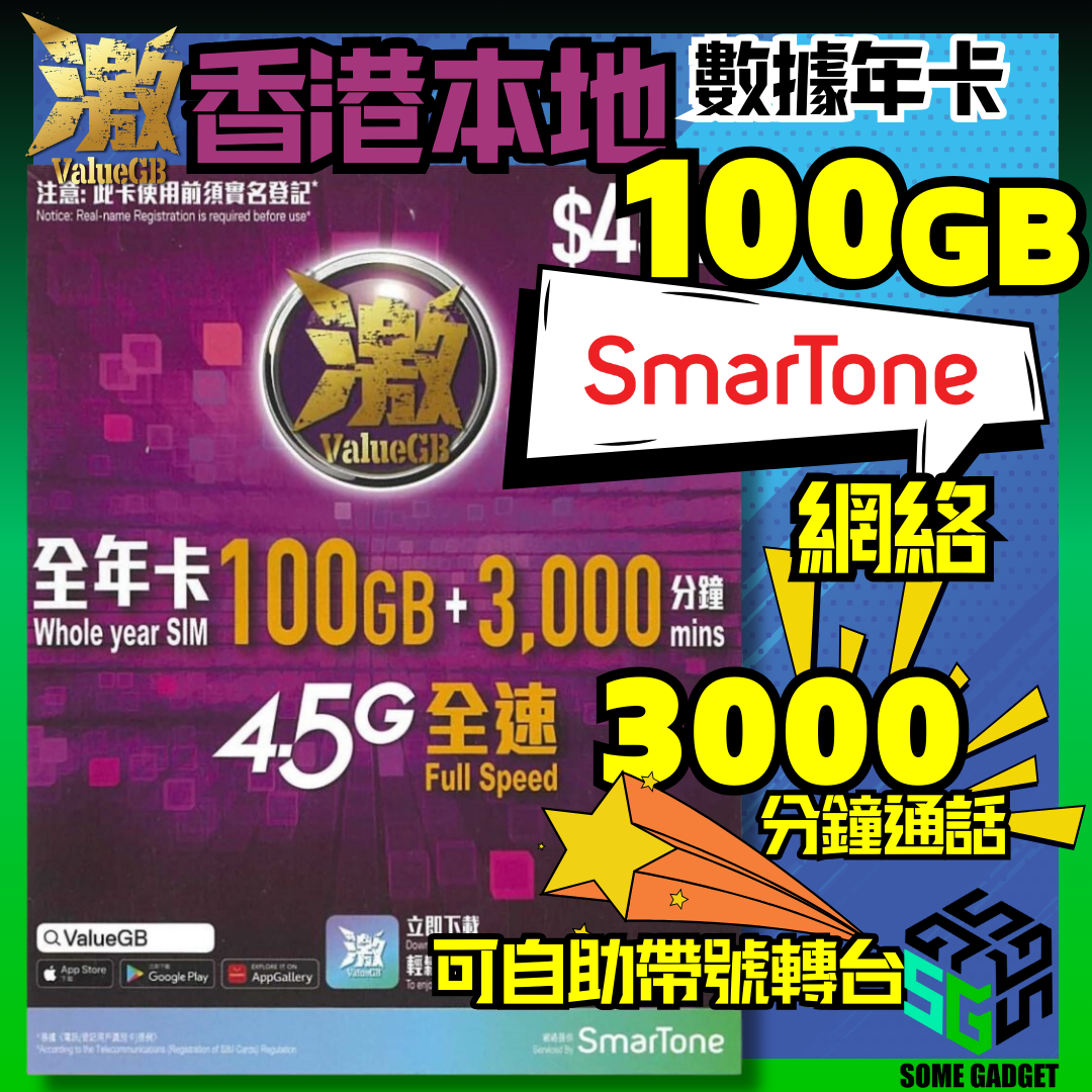 Smart ValueGB激 4.5G 100GB 1年 香港本地數據卡 - 大數據量使用