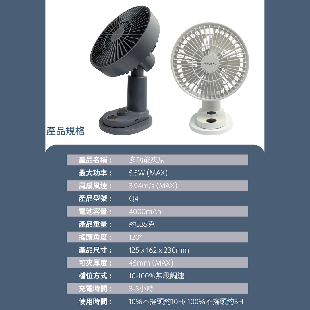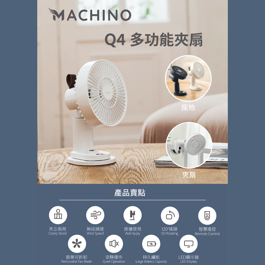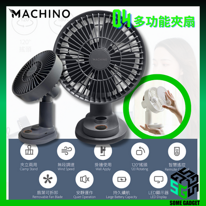Machino - Q4 多功能夾扇|5扇葉|夾枱|掛牆|4000mAh|120°定點搖頭 | 香港行貨